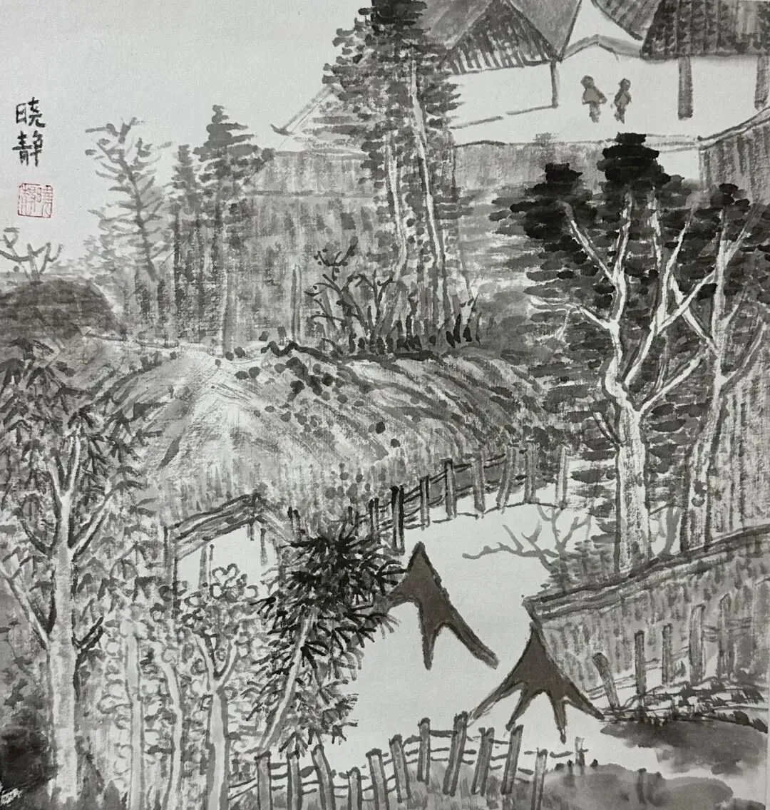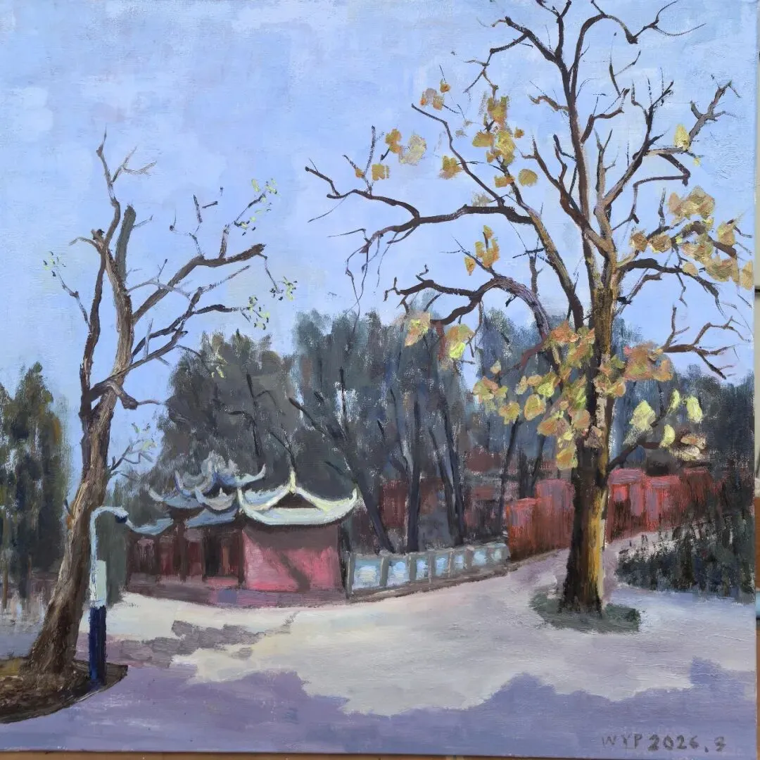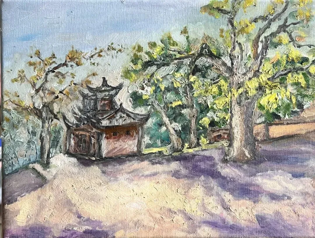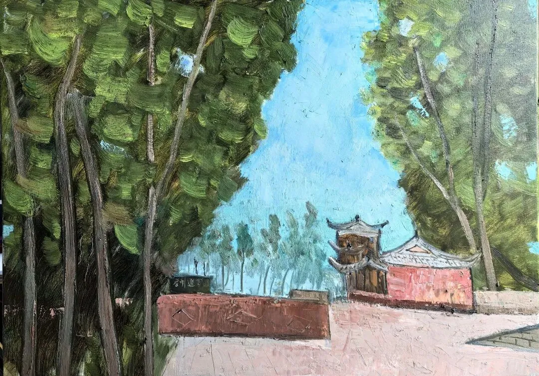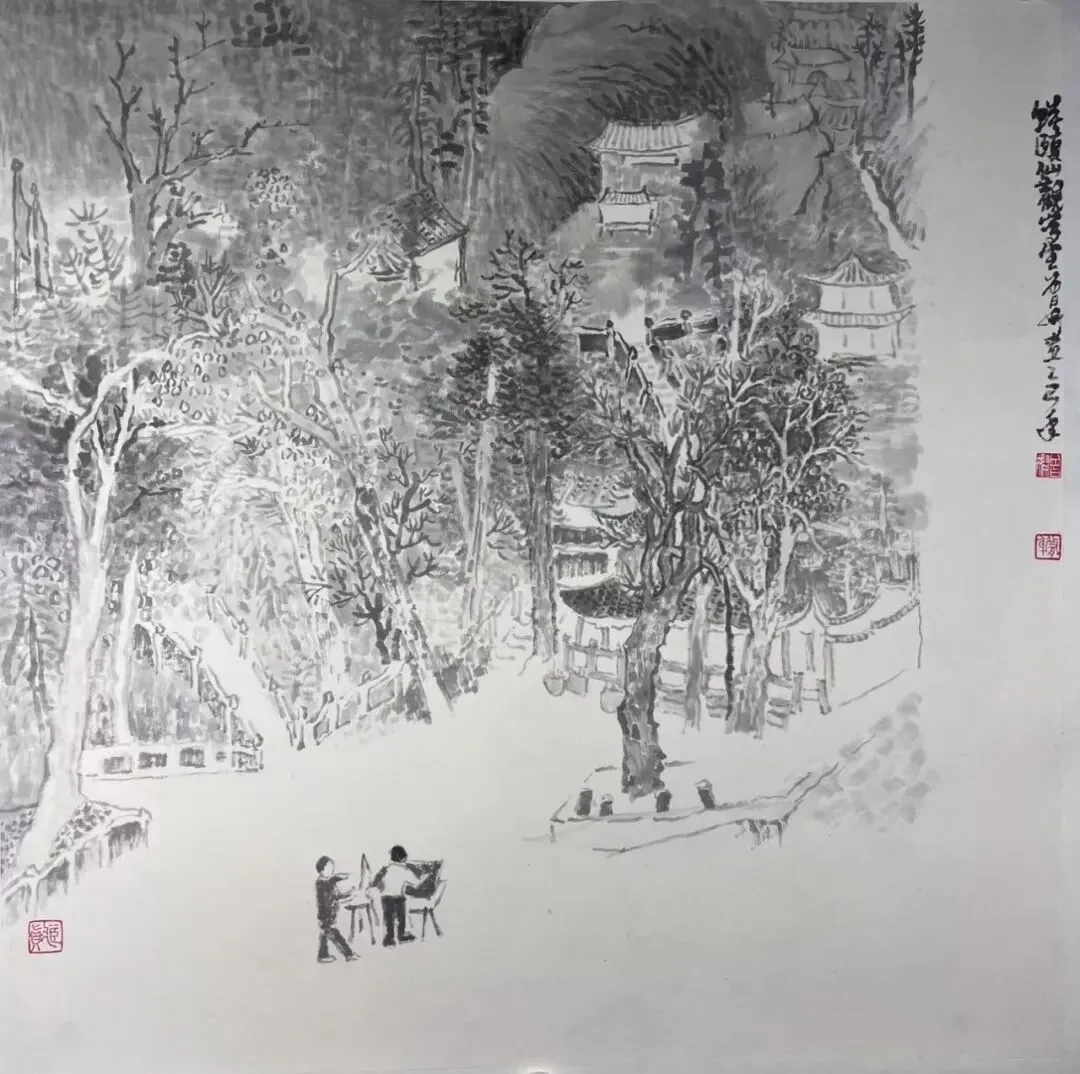 三月的蟆颐山,道观藏翠,山径蜿蜒,自然与人文交融的景致,为画家们赋予了无尽灵感。这33幅参展作品兼具扎实的写实功底与鲜明的个性表达,内容丰富而鲜活:既有蟆颐山道观点缀苍翠的全景勾勒,也有古建飞檐翘角的细节描摹;既有林间光影流转的细腻捕捉,也有远山层峦叠嶂的墨韵铺陈,还有山间一草一木的灵动刻画。每一笔都饱含真诚,每一幅都藏着匠心。