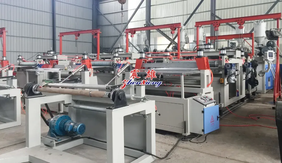 The plastic car fender extrusion line is composed of automatic feeding system, drying system, single screw extruder, double-layer flat die head, forming unit, traction unit, cutting unit, winding machine, and PLC electrical control system.