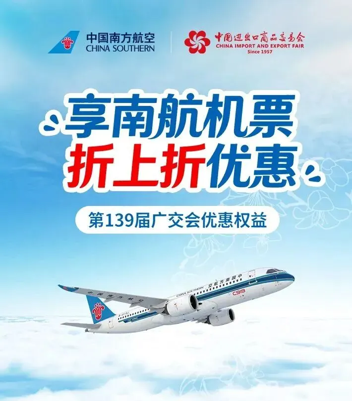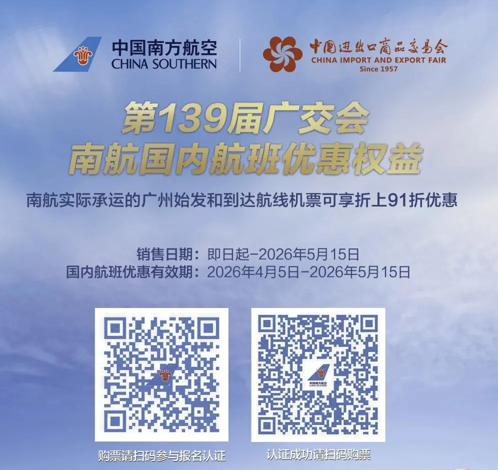广交会期间,南航进驻展馆珠江散步道A区5-1柜台,为全球参展商与采购商打造一站式航空出行体验,现场凭广交会证件即可享: