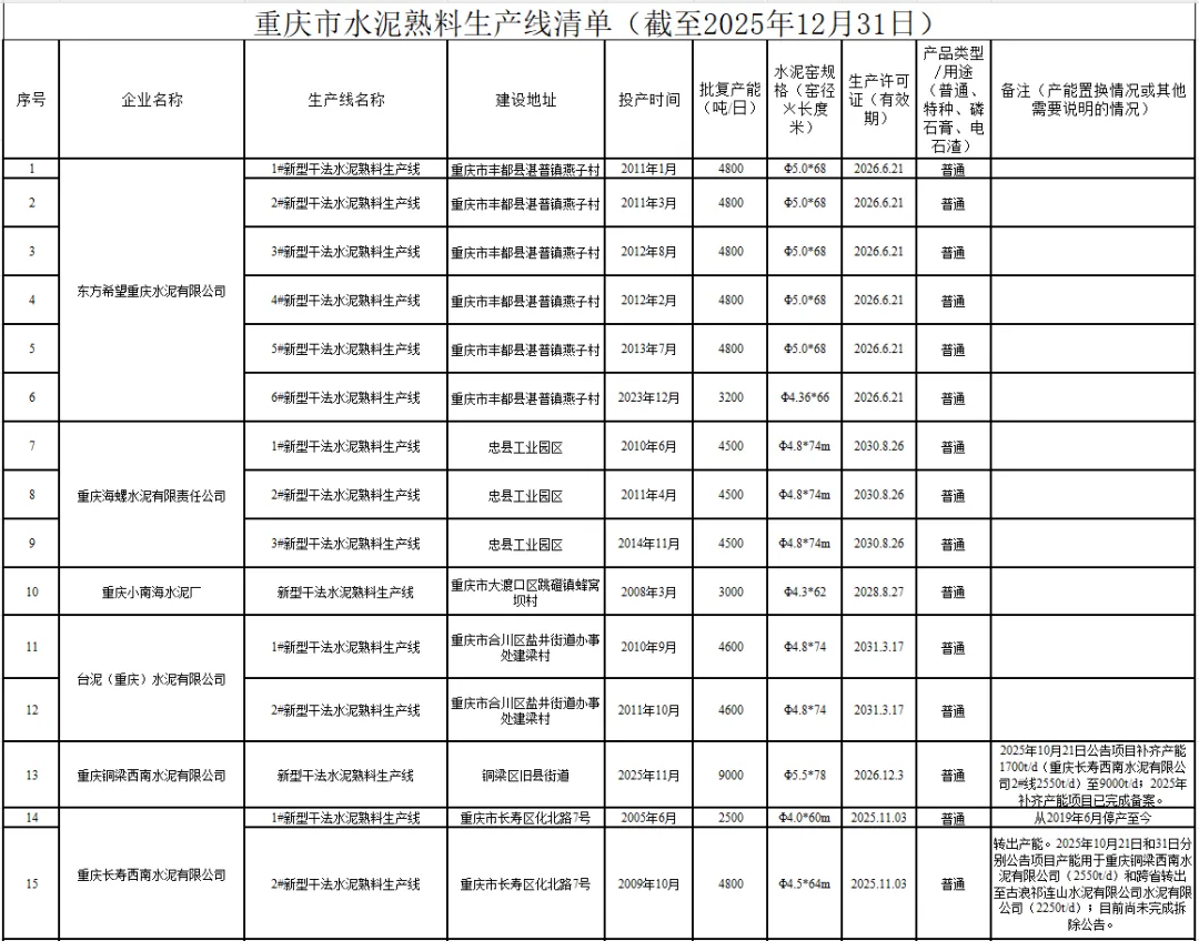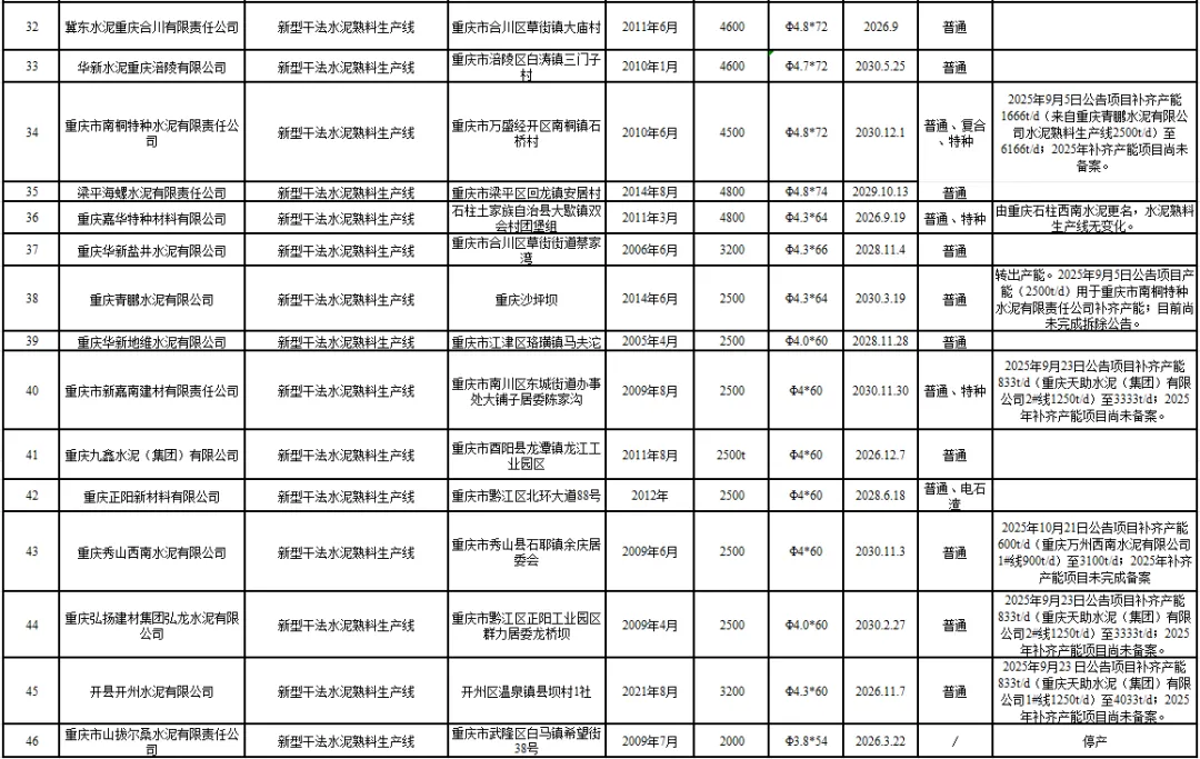 此次生产线清单的更新公示,反映了重庆市水泥行业产能调整、落后淘汰的持续推进态势。