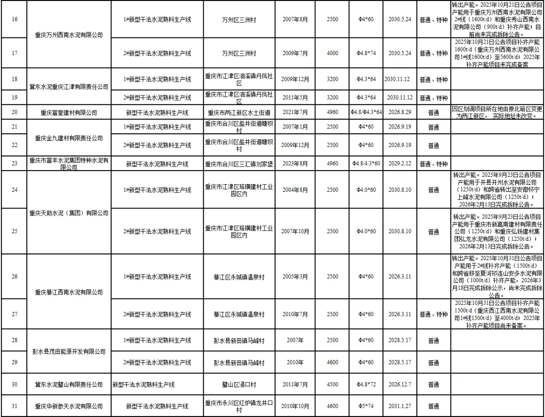 4月13日,重庆市经济和信息化委员会发布重庆市水泥熟料、平板玻璃生产线清单更新公示。根据公示内容,多条水泥熟料生产线处于停产或产能转出状态,具体情况如下: