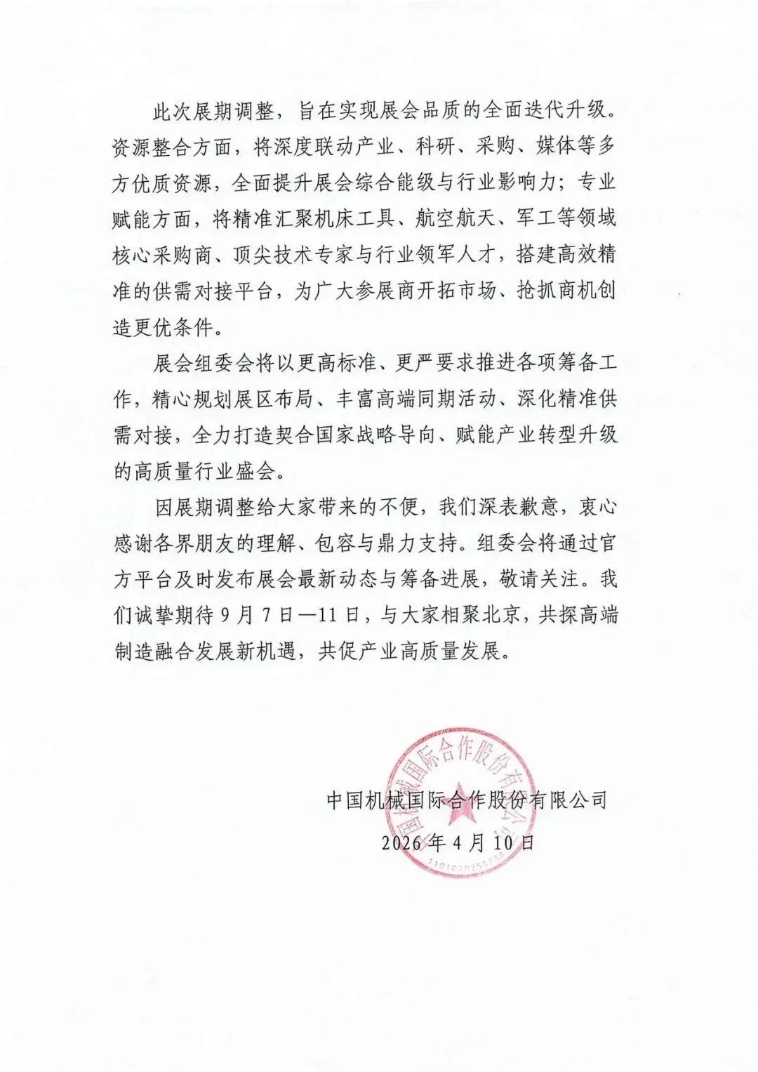 为深入贯彻落实国家“十五五”规划关于推动高水平科技自立自强、强化高端装备制造产业链协同发展的战略部署,充分发挥中央企业产业引领与资源整合优势,进一步助力装备制造业高质量发展,原定于2026年5月25日—29日在中国国际展览中心(北京.顺义馆)举办的第十七届中国国际机床工具展览会(CIMES 2026),现正式调整至2026年9月7日—11日举办,地点不变。