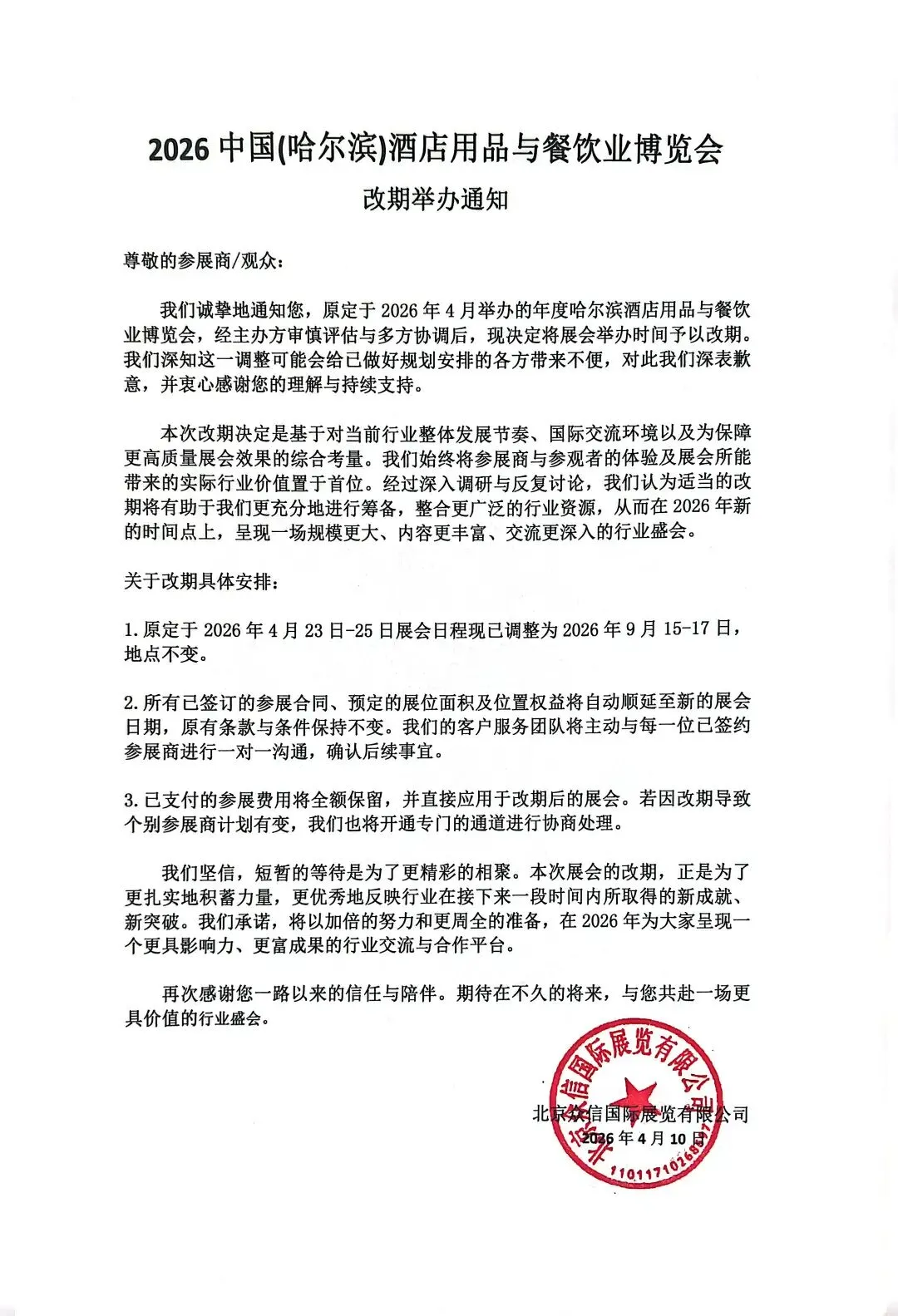 哈尔滨酒店用品博览会延期通知!