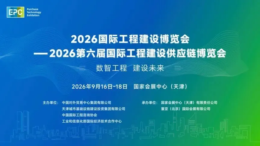 为深入贯彻党的二十届四中全会关于“加快构建新发展格局、扩大高水平对外开放”“推动绿色低碳发展、建设现代化产业体系的战略部署”的战略部署,落实“十五五”规划建议中“建设现代化基础设施体系、增强产业链供应链韧性”的核心要求,进一步强化国际工程建设供应链协同效能,助力京津冀区域基础设施互联互通与高质量发展,由中国对外贸易中心集团有限公司、天津城市基础设施建设投资集团有限公司、中国国际工程咨询协会、工业和信息化部国际经济技术合作中心等联合主办,国家会展中心(天津)有限责任公司、寰亚(北京)国际会展有限公司(国际工程)等承办的2026国际工程建设博览会、2026第六届国际工程建设供应链博览会(以下简称博览会)定于2026年9月16至18日在国家会展中心(天津)举办,同期将举办2026绿色低碳博览会。本届博览会将聚焦工程建设智能化、绿色化、融合化发展趋势,集中展示中国建造、智慧建造、绿色建材等尖端成果,设置智能建造、绿色节能建材、工程服务等展区,贯通产业链条,助力中国技术、装备与服务依托“一带一路”走向世界,提升行业供应链韧性与全球竞争力。