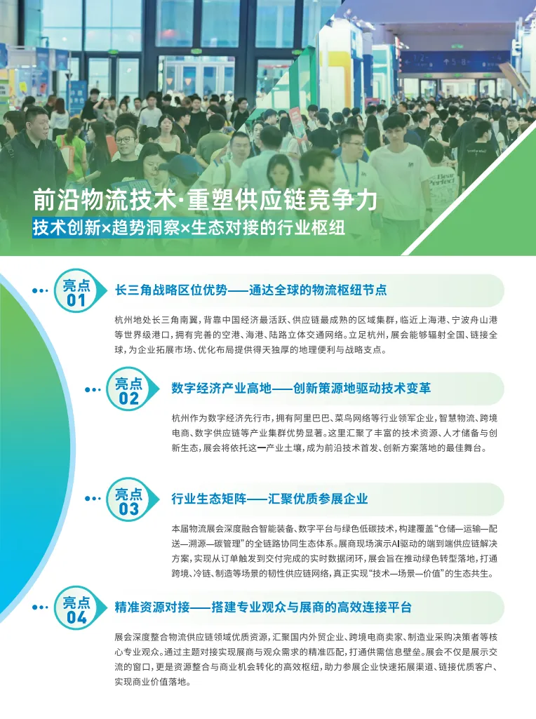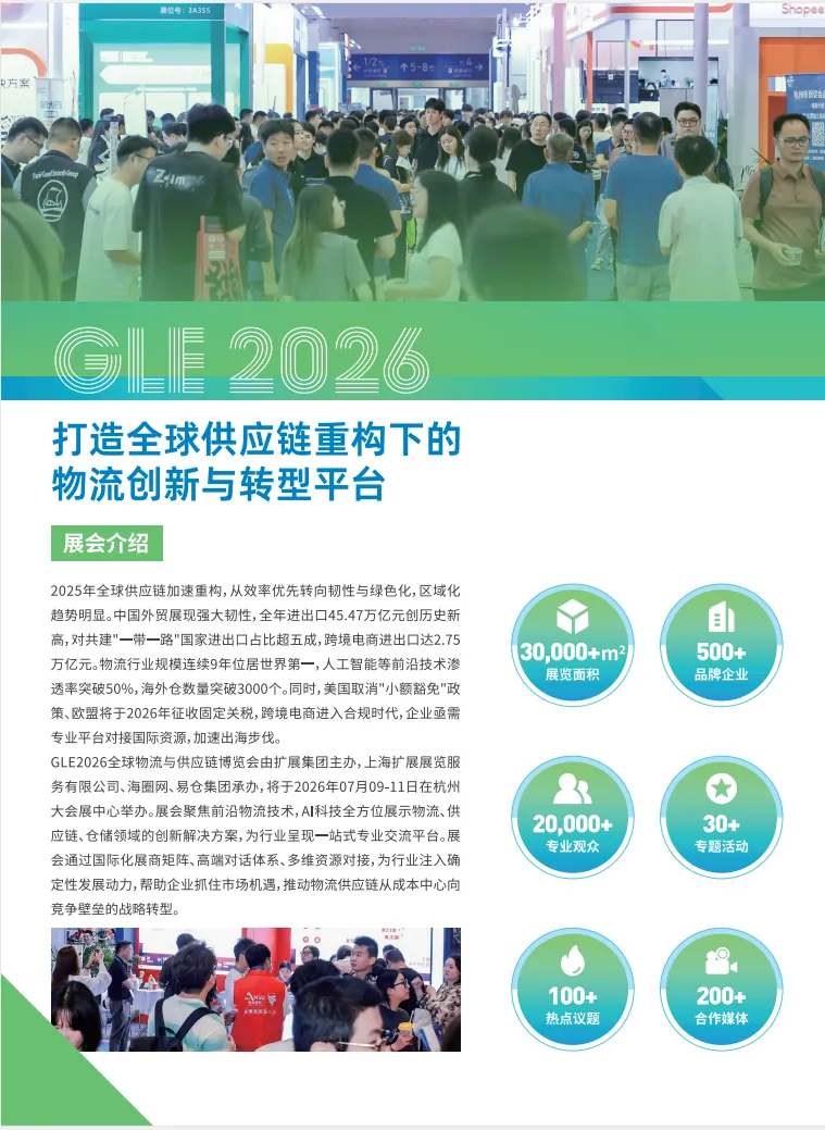 GLE2026全球物流与供应链博览会由扩展集团主办,上海扩展展览服务有限公司、海圈网、易仓集团承办,将于2026年07月09-11日在杭州大会展中心举办。展会聚焦前沿物流技术,Al科技全方位展示物流、供应链、仓储领域的创新解决方案,为行业呈现一站式专业交流平台。展会通过国际化展商矩阵、高端对话体系、多维资源对接,为行业注入确定性发展动力,帮助企业抓住市场机遇,推动物流供应链从成本中心向竞争壁垒的战略转型。