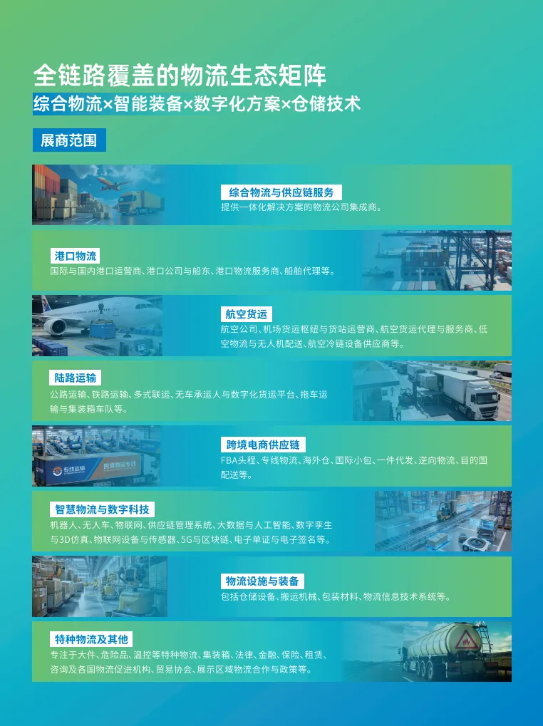8. 特种物流及其他:专注于大件、危险品、温控等特种物流、集装箱、法律、金融、保险、租赁、咨询及各国物流促进机构、贸易协会、展示区域物流合作与政策等。