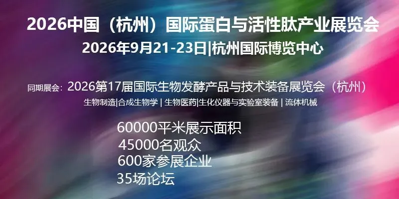 2026 中国(杭州)国际蛋白与活性肽产业展览会,将于9 月 21 日 —23 日在杭州国际博览中心举办,展会规模达 60000 平米,汇聚 600 家企业,预计吸引 45000 名专业观众,同期联动第 17 届国际生物发酵产品与技术装备展览会。