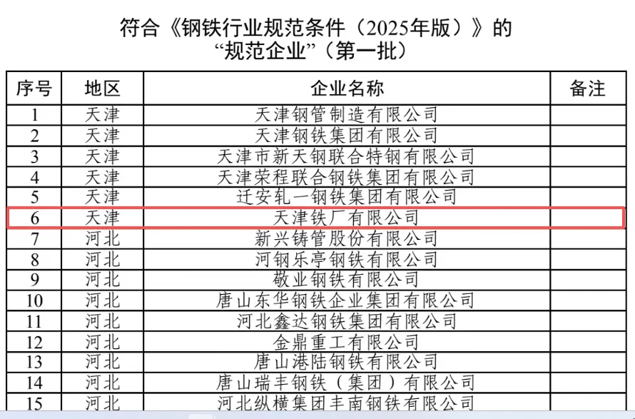 近日,工业和信息化部正式公布首批符合《钢铁行业规范条件(2025年版)》企业名单,天津铁厂有限公司成功入选“规范企业”,再获国家级权威认证。