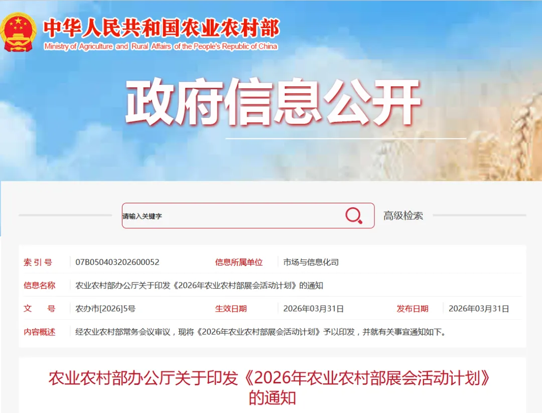 经农业农村部常务会议审议,现将《2026年农业农村部展会活动计划》予以印发,并就有关事宜通知如下。