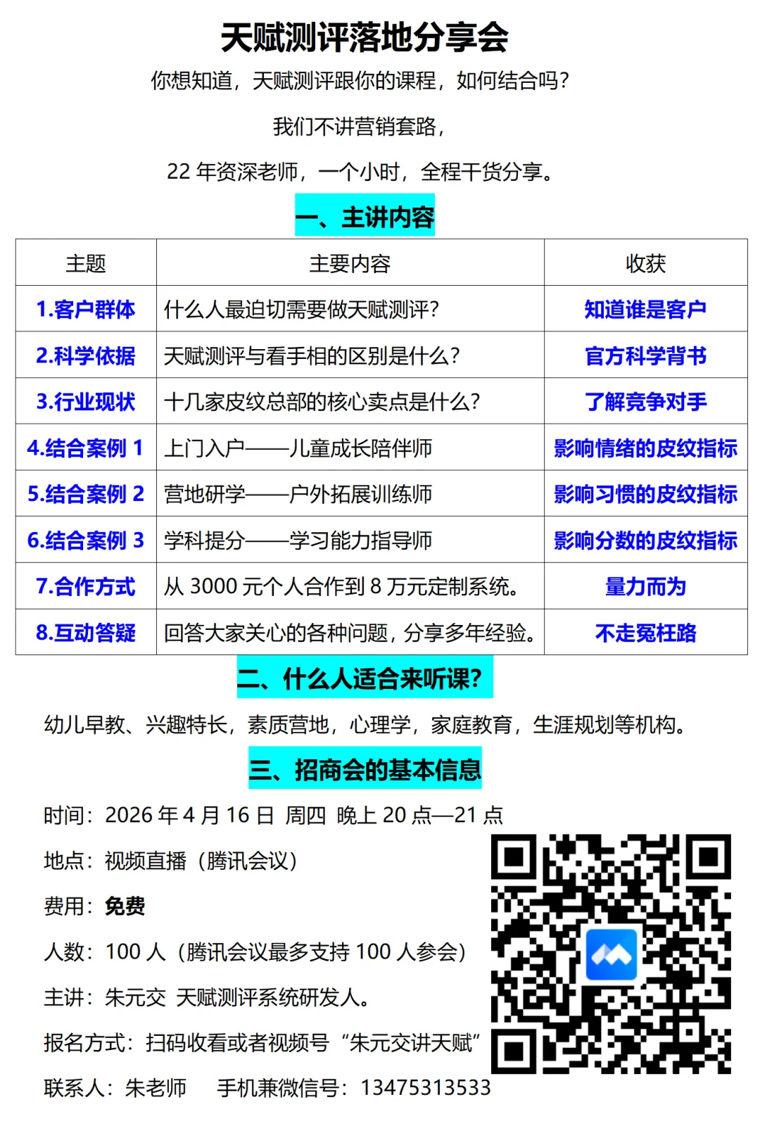 大会名称:天赋测评项目说明会 培训时间:2026年4月22日—23日 全程直播:现场培训+线上直播。 会议地址:山东○济南○金桥国际大厦C座4楼会议室 交通食宿:自理。(免费提供2天的午餐)。 线下参会:199元/人。(三人成团,一人免票) 线上直播:99元/人。(可以回放7天) 项目路演:500元。(10分钟,送2个名额、现场摆放彩页和展架)
