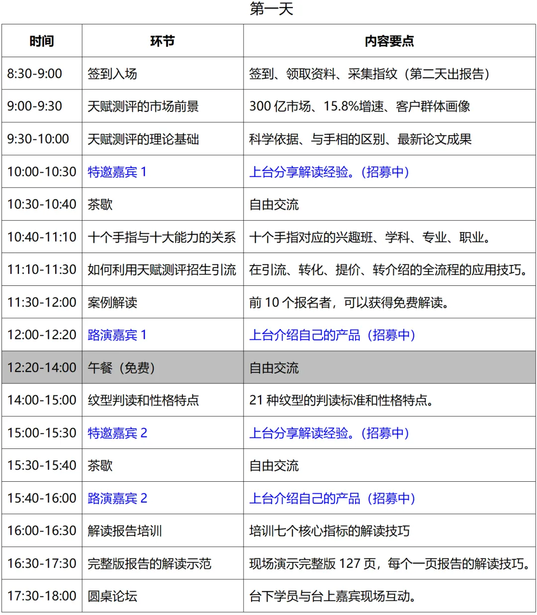 天赋测评的市场前景和行业现状。 天赋测评的科学依据和最新成果。 十个手指与兴趣班、学科、专业的关系。 纹型的判读标准和性格特点。 七大核心指标的解读技巧 天赋测评与亲子关系、学科提分、生涯规划的结合技巧。 天赋测评的24种盈利模式。