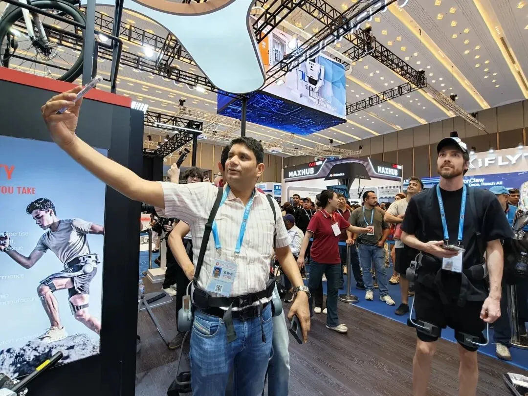 “Very nice , amazing! ”在智能穿戴专区,海外客商排队体验腰部助行外骨骼产品,连连发出赞叹。