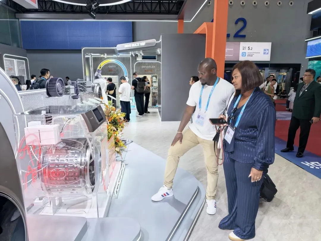广交会现场,海外采购商与机器人互动,感受科技魅力。