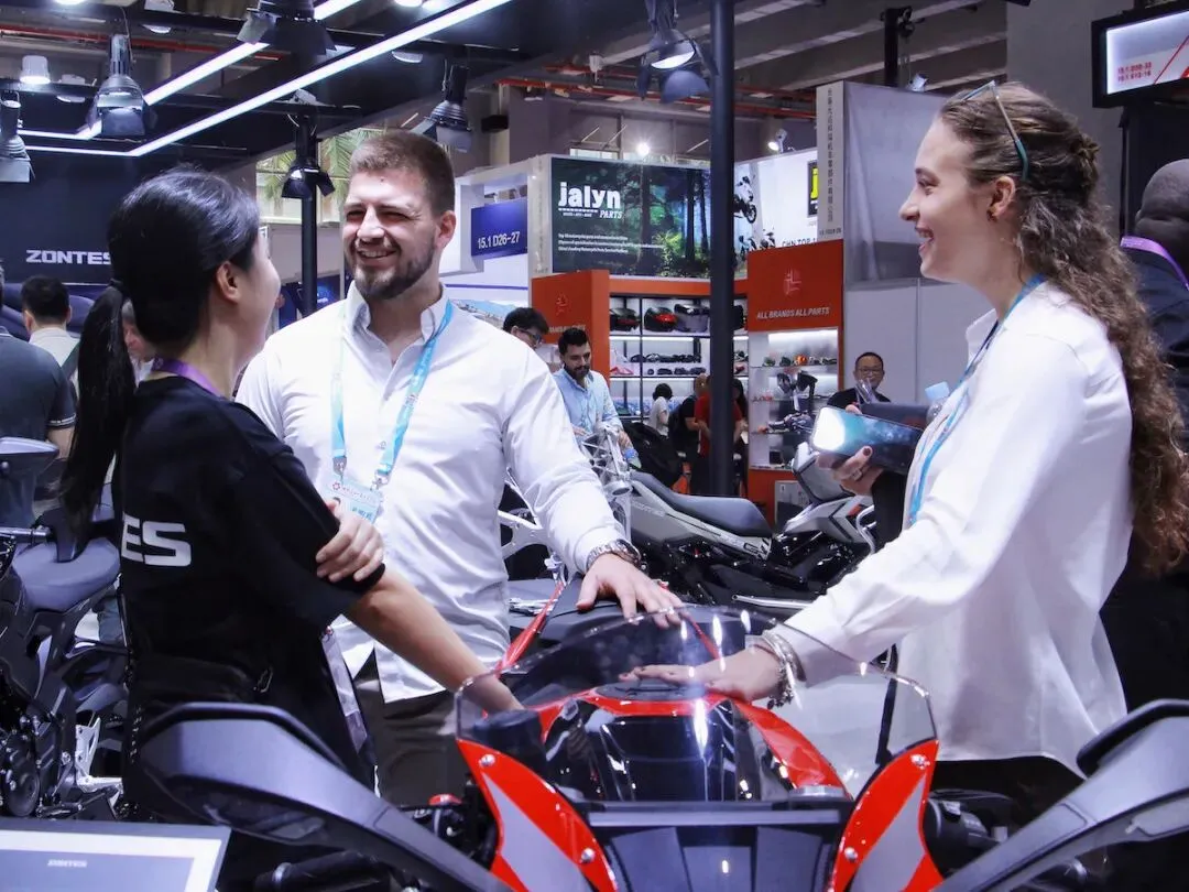 广交会现场,海外采购商向工作人员了解摩托车性能