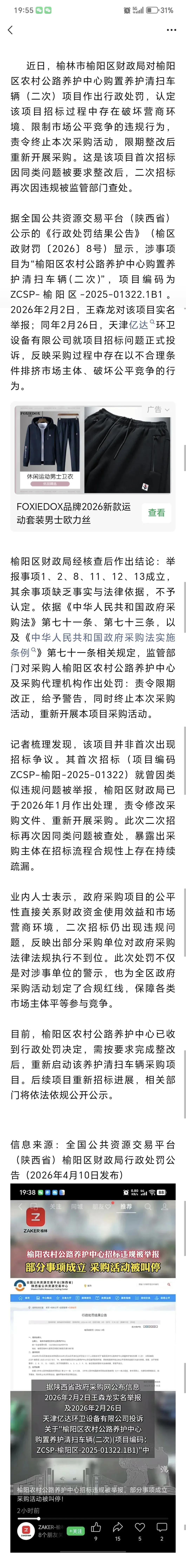 近日,榆林市榆阳区财政局对榆阳区农村公路养护中心购置养护清扫车辆(二次)项目作出行政处罚,认定该项目招标过程中存在破坏营商环境、限制市场公平竞争的违规行为,责令终止本次采购活动,限期整改后重新开展采购。这是该项目首次招标因同类问题被要求整改后,二次招标再次因违规被监管部门查处。
