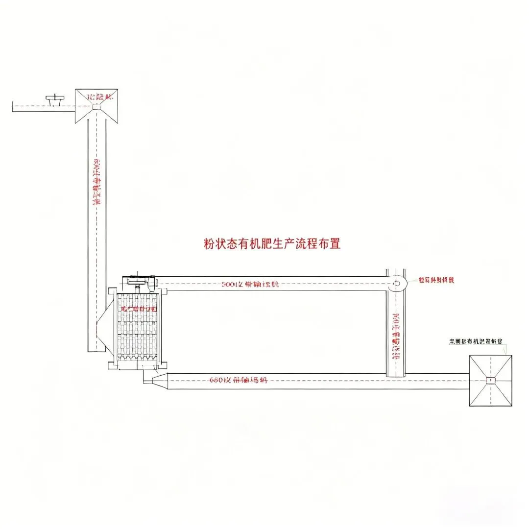 我们公司设计的粉状有机肥生产线工艺流程;将发酵后的有机肥原料、原料仓、皮带输送机、筛分机、定量包装秤、包装、成品库。不合格产品,输送机、立式粉碎机、皮带输送机、有机肥原料仓、去进行筛分。