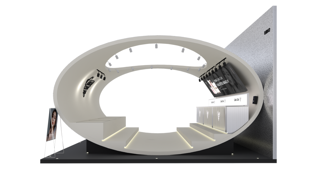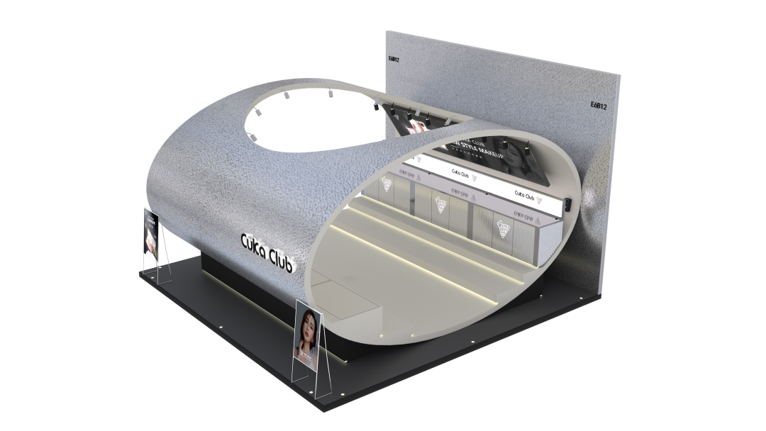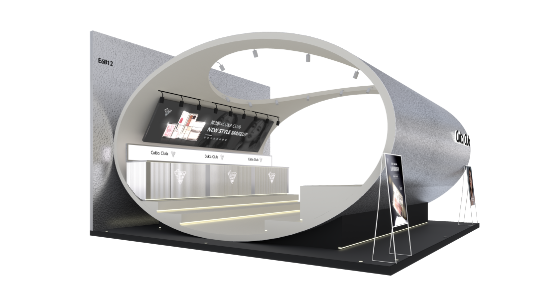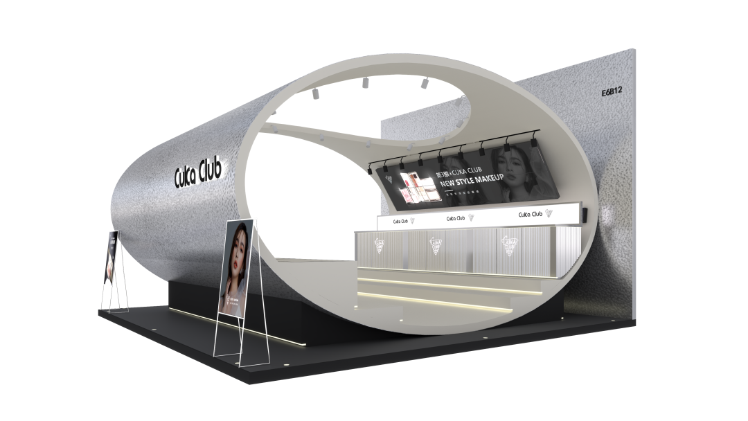 展柜整体呈椭圆型的太空舱样式,沿壁放置柜台镜面灯光等装饰其中。展柜以科技银色为主色调,白色和黑色点缀其中,全金属材质搭配上水晶波纹板设计给人尊贵、纯净、永恒的感觉,通用面板设计灵活多变,将独创性与卓越品质完美结合,打造出赛博星球太空舱的未来空间设计,星际未来感十足!即迎合了第3眼CUKACLUB品牌当下的银镜系列彩妆新品概念,同时突显品牌参与本次上海美博会的创新性和亮点