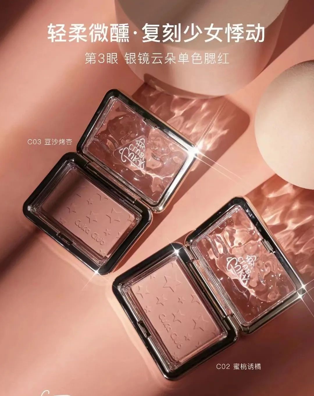7、银镜云朵单色腮红,氛围四色甜度超标,个性百搭显嫩又减龄,细腻粉质,新手使用易上手 。