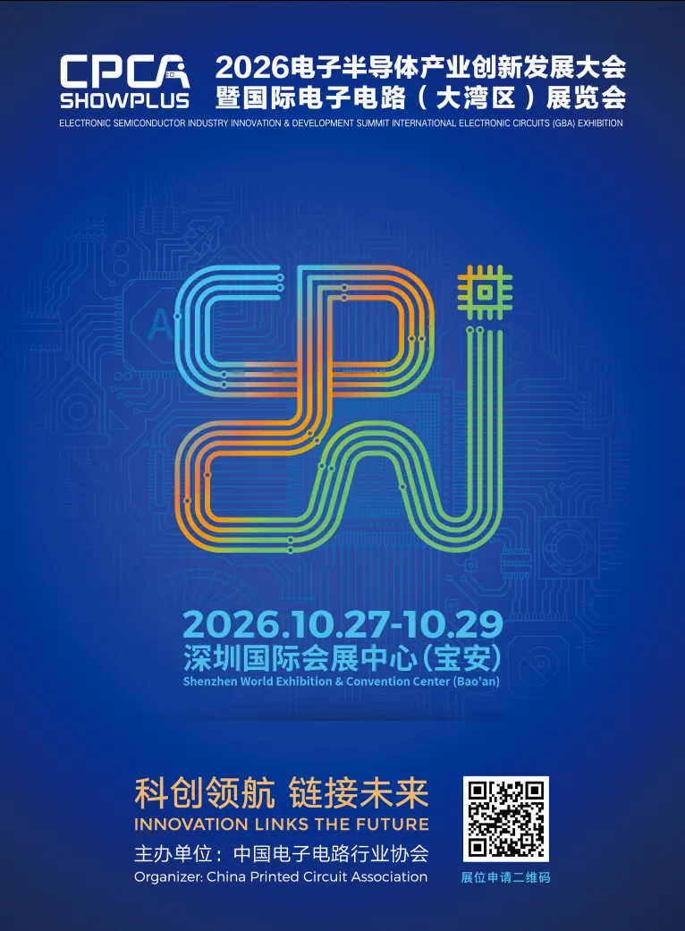 名称:2026电子半导体产业创新发展大会暨国际电子电路(大湾区)展览会 主题:科创领航,链接未来 时间:2026年10月27-29日(10月30日16:00闭馆) 地点:深圳国际会展中心(宝安)6/8号馆 主办:中国电子电路行业协会(CPCA) 规模:面积40,000㎡(+25%);展商390+(+21%);观众45,000+(+10.8%)