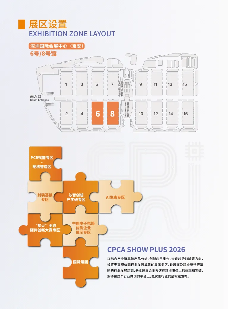 产业风口:AI算力爆发驱动高阶PCB、先进封装、Chiplet、车规级需求井喷 市场:2026全球PCB规模1052亿美元,增速13.9% 区位:立足粤港澳大湾区(全球最大电子制造集群),辐射华南、对接全球 模式:会+展+X,7大展区+20余场论坛