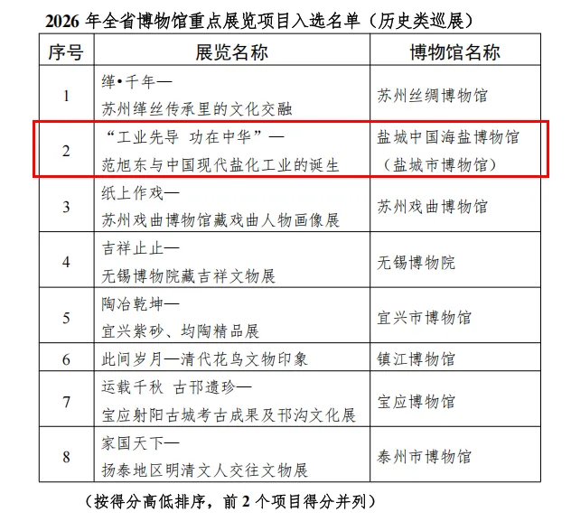 (数字盐城4月16日讯)2026年4月13日,江苏省文化和旅游厅(省文物局)公布“2026年度全省博物馆纪念馆重点展览项目”,盐城中国海盐博物馆(盐城市博物馆)策展的《工业先导 功在中华——范旭东与中国现代盐化工业的诞生》荣获历史类巡展重点展览项目。