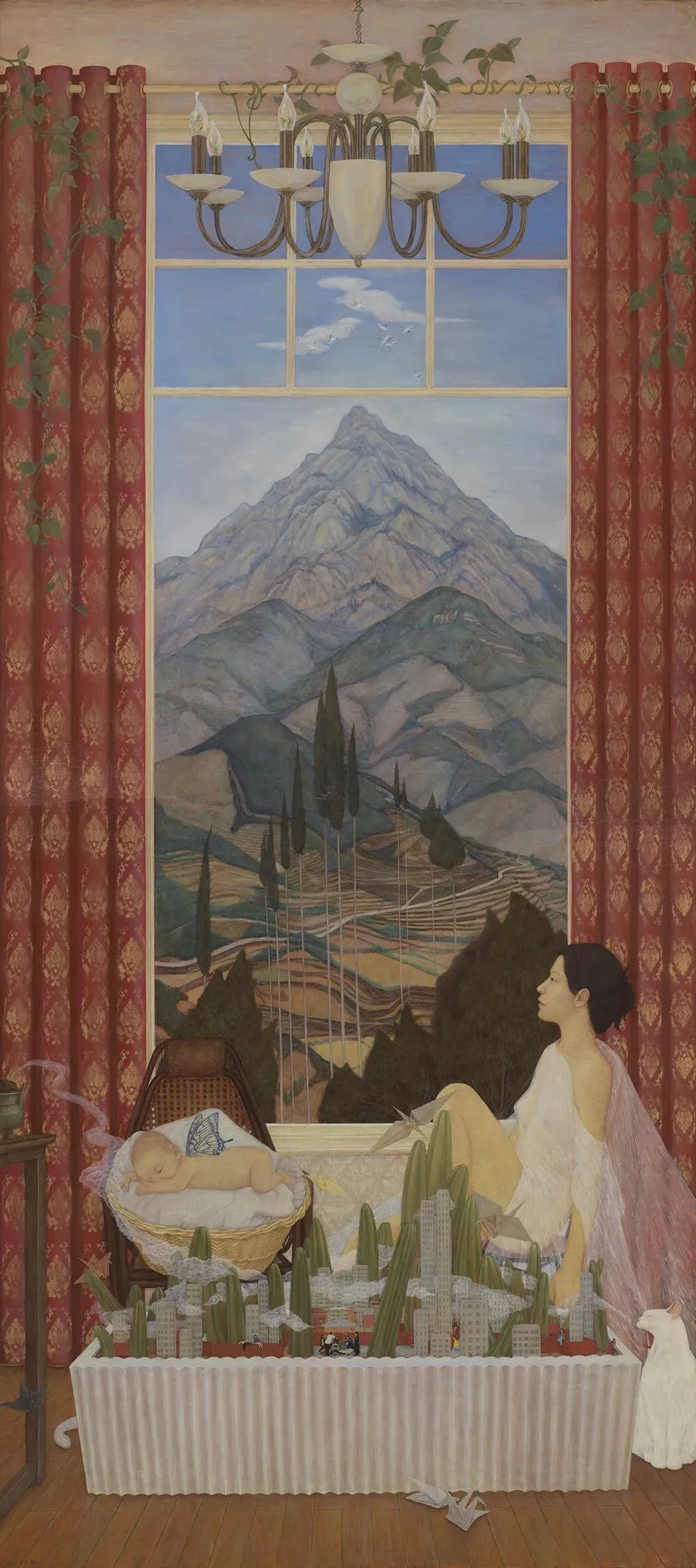 任得智 盆景里的共生诗之二 280×127cm 油性坦培拉 2025年