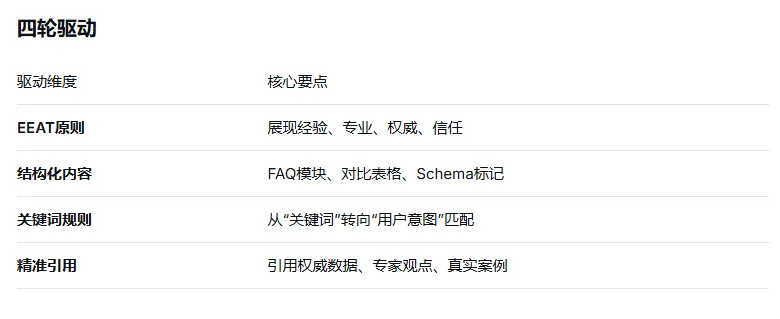 业内经过验证的“两大核心+四轮驱动”GEO方法论已成为B2B企业布局GEO的标配: