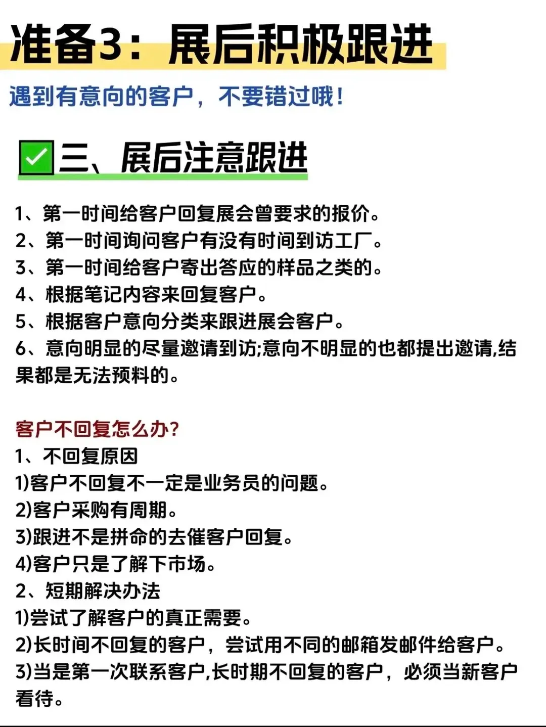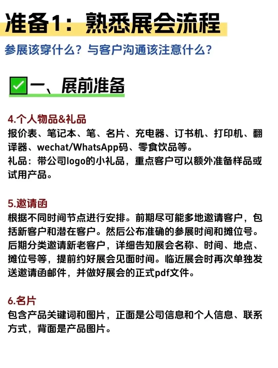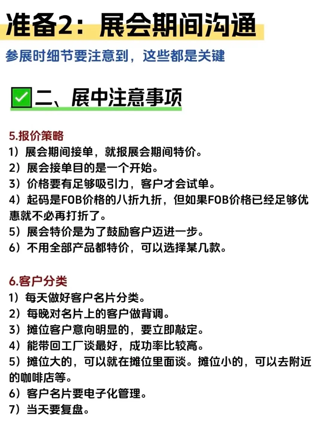 作为外贸新人,别因为初次参加大型展会手忙脚乱就不做这些基本功了,要知道,参加展会和客户交换名片只是刚开始,后面要转成你真正手里的订单还有一段距离。