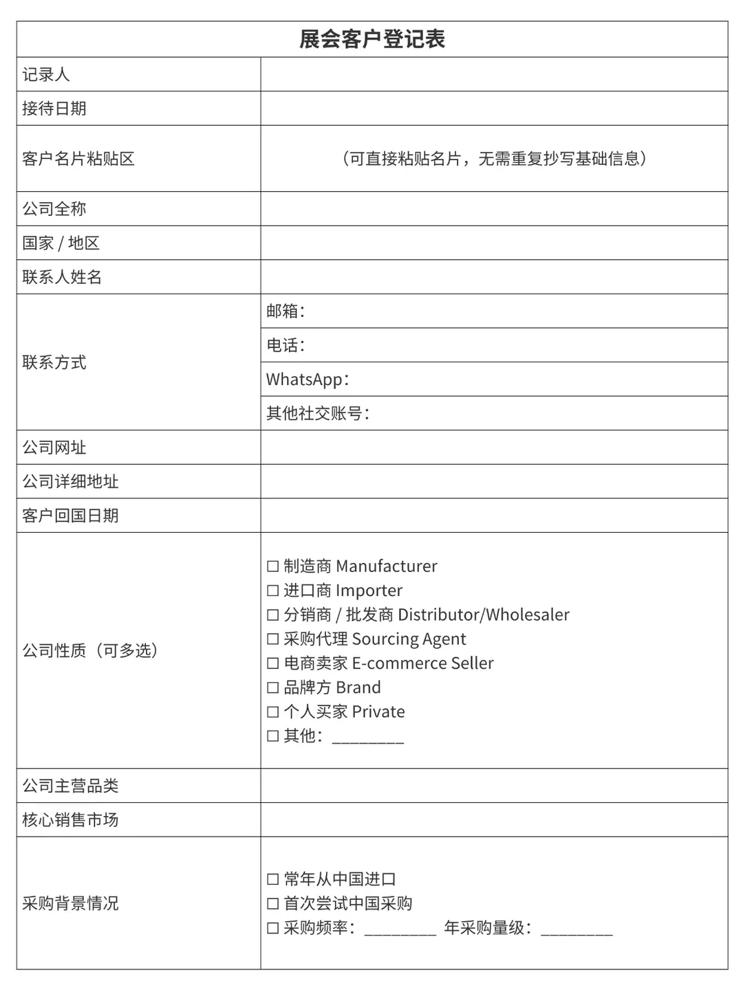有需要的可以打印这份展会信息记录表,多打印一些,谁也不知道接下来你要接待多少金主霸霸?要知道每一位从你的身前走过的,那都是飘过的订单,千万不要吃了新人的亏,以为聊几句这客户就板上钉钉了?