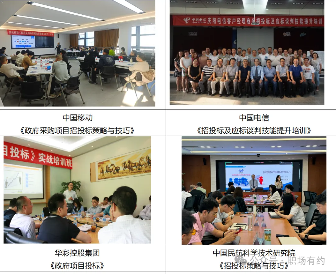招投标采购项目、教育部职成司全国职校技能实训室入围项目等投标项目超过200个,涉及金额10亿元;?曾为上海证券交易所、中国银联、中国移动、中国电信、中国联通、中国铁塔、惠普(中国)、平安集团、中国人保、工商银行、招商银行、邮储银行、中广核集团、国家能源集团、国家电网、中铁物资集团、中国电子科技集团、华彩控股集团、中建一局、中建四局、中建七局、中铁二局、中化七建、广汽集团、一汽大众、新华三集团、华为技术、中交四航局、中交水利、长江建设、三一重工、中联重科等多家上市公司及集团型企业提供政府采购与招投标项目的指导与培训,通过系统性的知识串联,提供专业的招投标营销工具和方法,提升企业参与政府采购及招标投标项目的能力及成功率,课程满意度高达95%以上,深受企业认可。