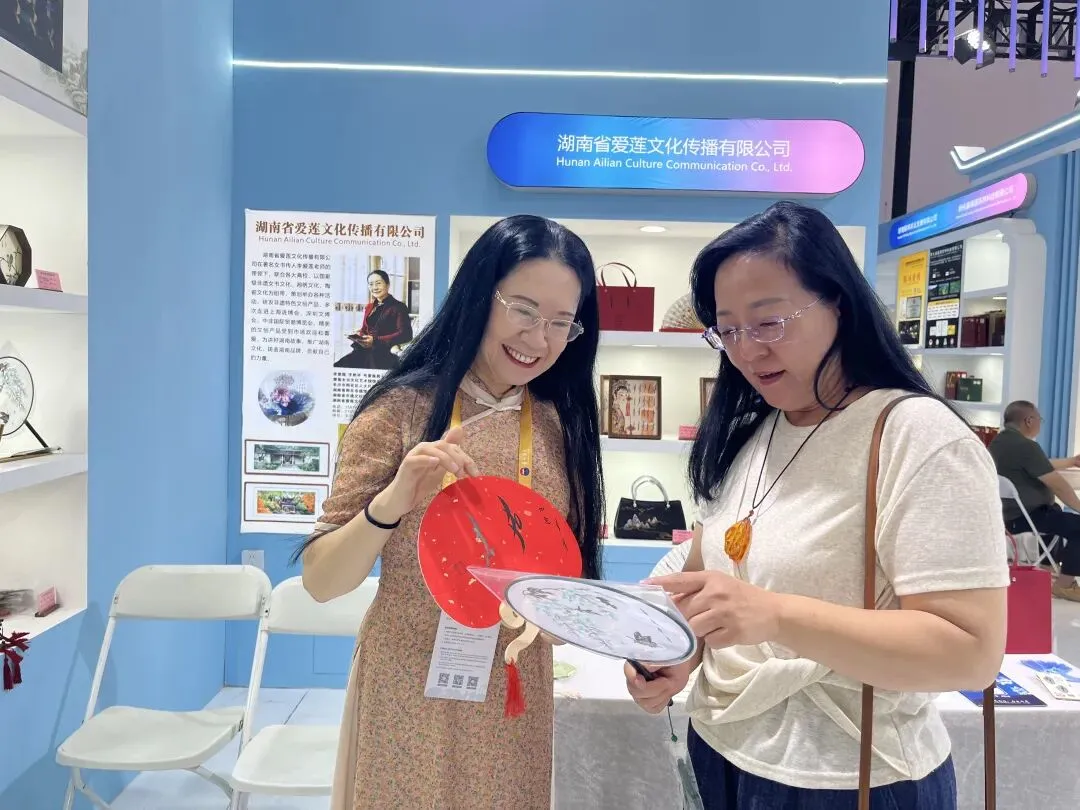 在湖南展台上“女书”文化传承人李爱莲向海南省艺术家促进会会长顾简女士介绍“女书”的人文历史和文创之路