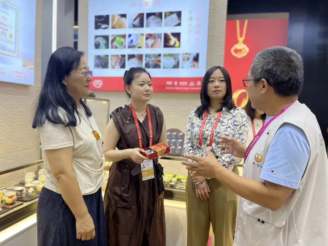 中国珠宝协会白银专业委员会秘书长赵欣华、梦祥银总经理李梦荷向海南省艺术家促进会顾简会长介绍白银工艺品