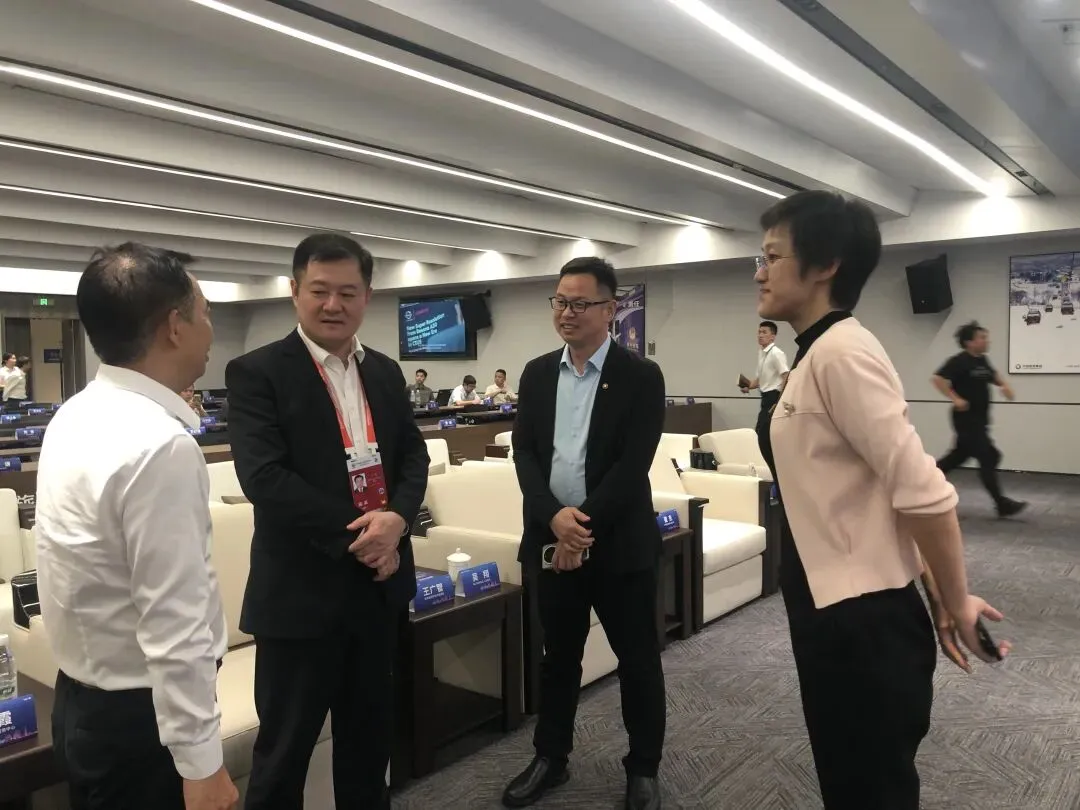 左起:海南省艺术家促进会顾简会长、《中华商报》副社长沈普芳、湖北省商务厅“消博会”展团负责人李丽萍、房县忠良黄酒董事长王忠朝在交流“消博会”合作情况