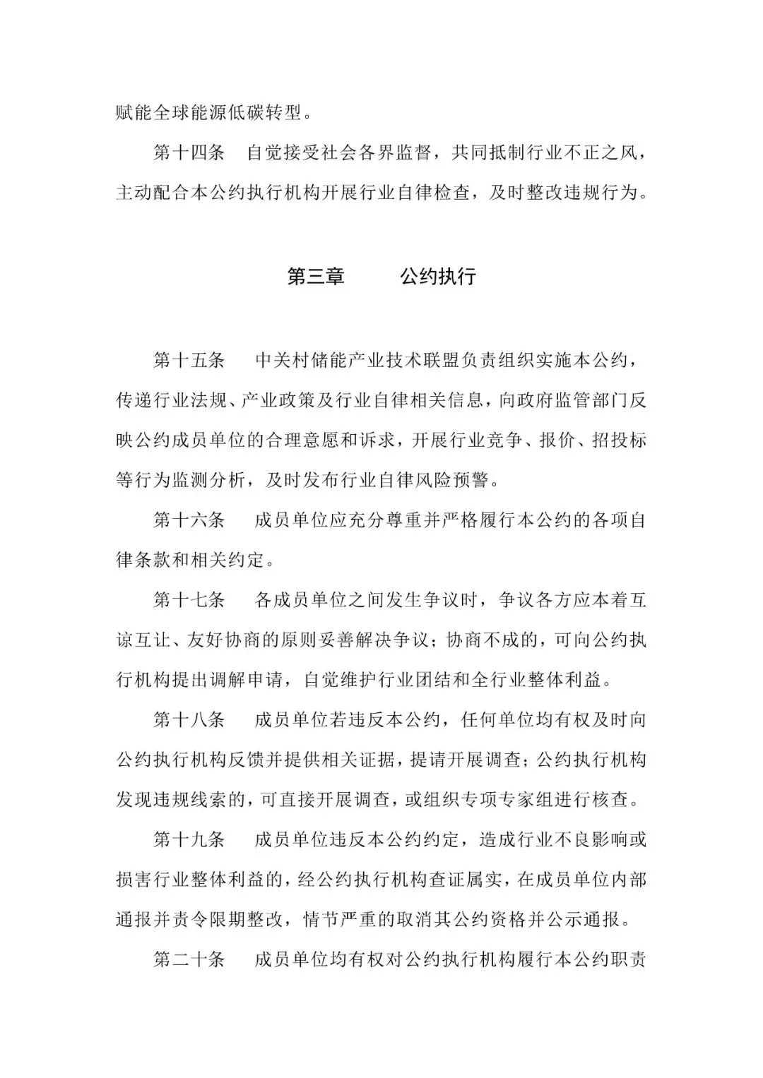 中关村储能产业技术联盟作为本公约的执行机构,负责组织实施本公约,建立健全行业自律监测体系,配合政府监管部门开展行业监管调研等支撑工作。