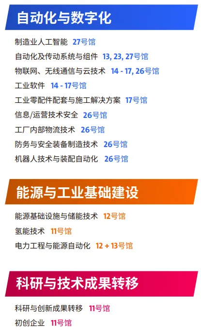 展览涵盖的行业和门类最全(有自动化与数字化、能源及工业基础建设、科研与技术成果转移等三大类十四分项的行业及主题)的国际性综合工业博览盛会;