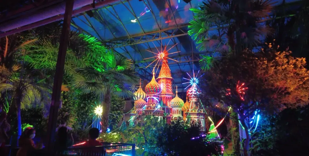 面积17000平方米,为“一天零一夜”精灵丛林艺数馆。种植了400余种沙漠植物、130余种热带雨林、200多种多肉植物、100多种南北方果树,并利用声光影、VR、虚拟空间等手法,打造成为特色独具、研学结合、北方独有的沉浸式“日游+夜游”森林奇幻之旅。
