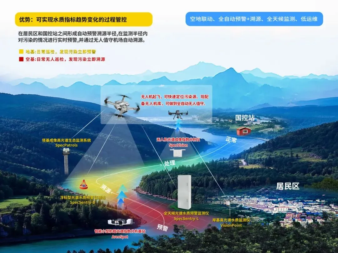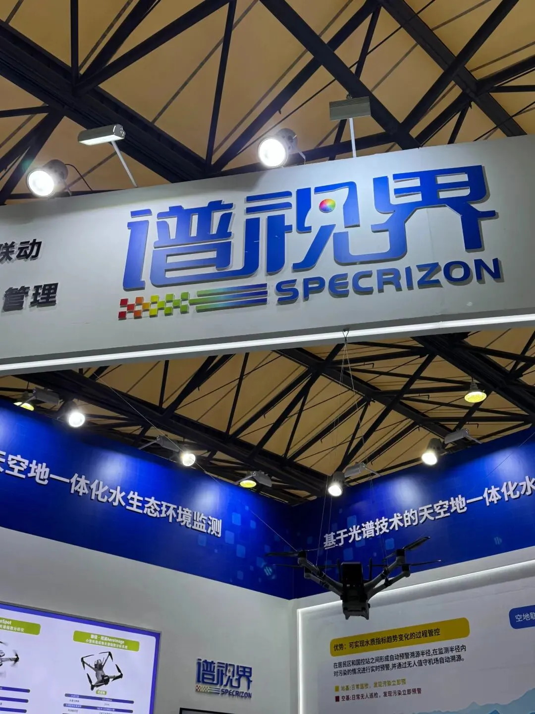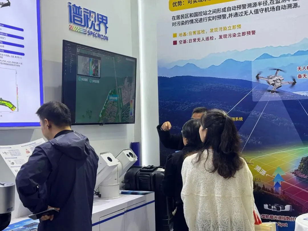 本次展会,谱视界携“空地一体化”水生态环境智能监测系统的产品亮相,涵盖空基(无人机高光谱影像遥感监测)、地基(实时水面航测、地面重点监测)等多类型光谱水质监测设备,空地联动,可实现全自动预警+溯源与全天候监测。