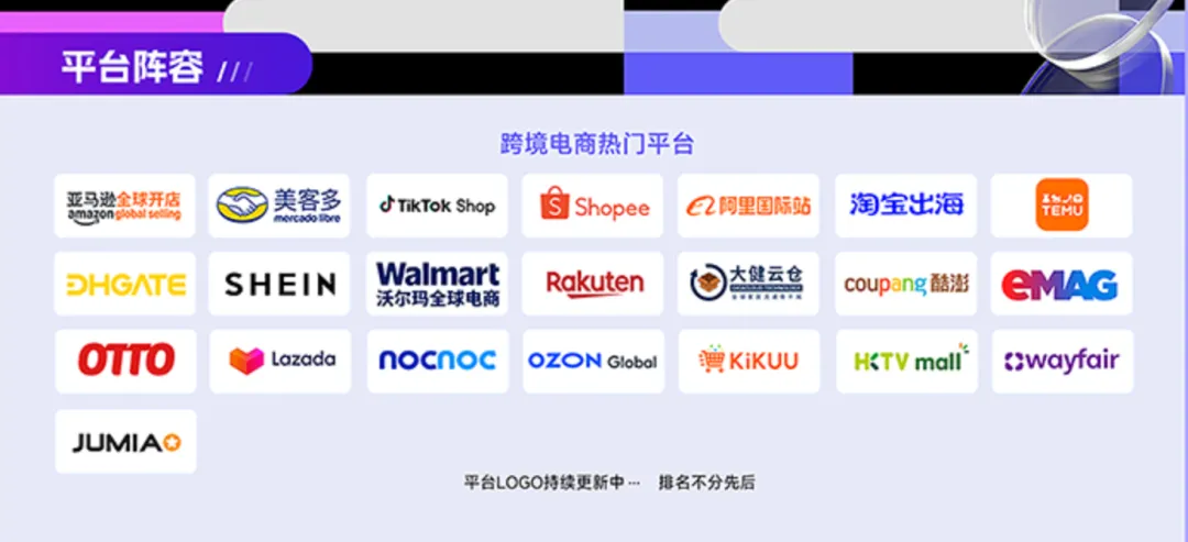本届大会集结了 50+全球主流跨境电商平台,不仅有亚马逊、TikTok Shop、TEMU、SHEIN、速卖通、美客多、沃尔玛、Wayfair等头部巨头深度参与,更有OTTO、Kikuu、Jumia、eMag等众多新兴市场及区域蓝海特色平台集体亮相。