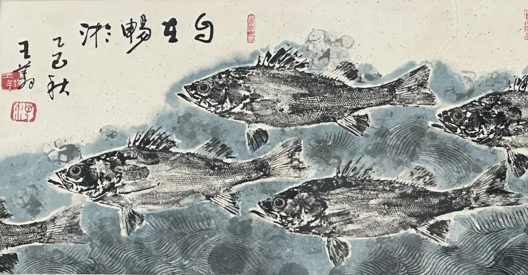 本次展览聚焦非遗与水墨的跨界融合,集中展示王翔老师的水墨拓鱼、无笔画等系列作品。他将拓印的厚重质感与水墨的浓淡变化相融:在水墨拓鱼中还原生灵的鲜活气韵,在无笔画中以墨造境、于无形处见章法,更通过砖刻拓片定格千年历史文脉,全方位展现传统拓印技艺的深厚底蕴与当代表达。