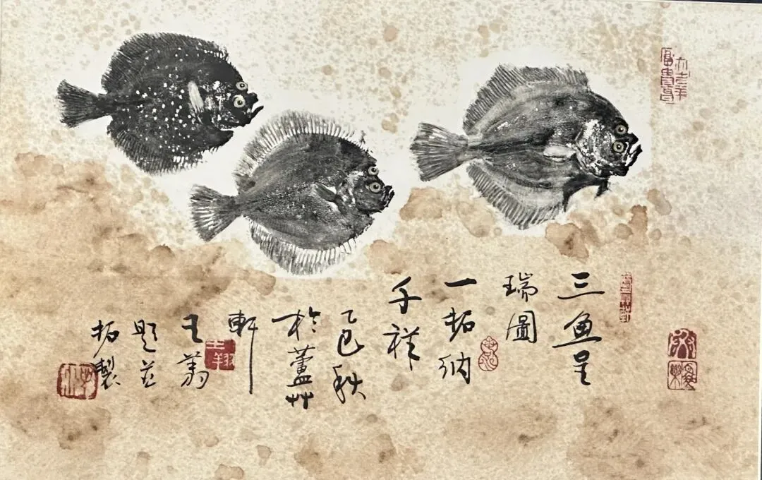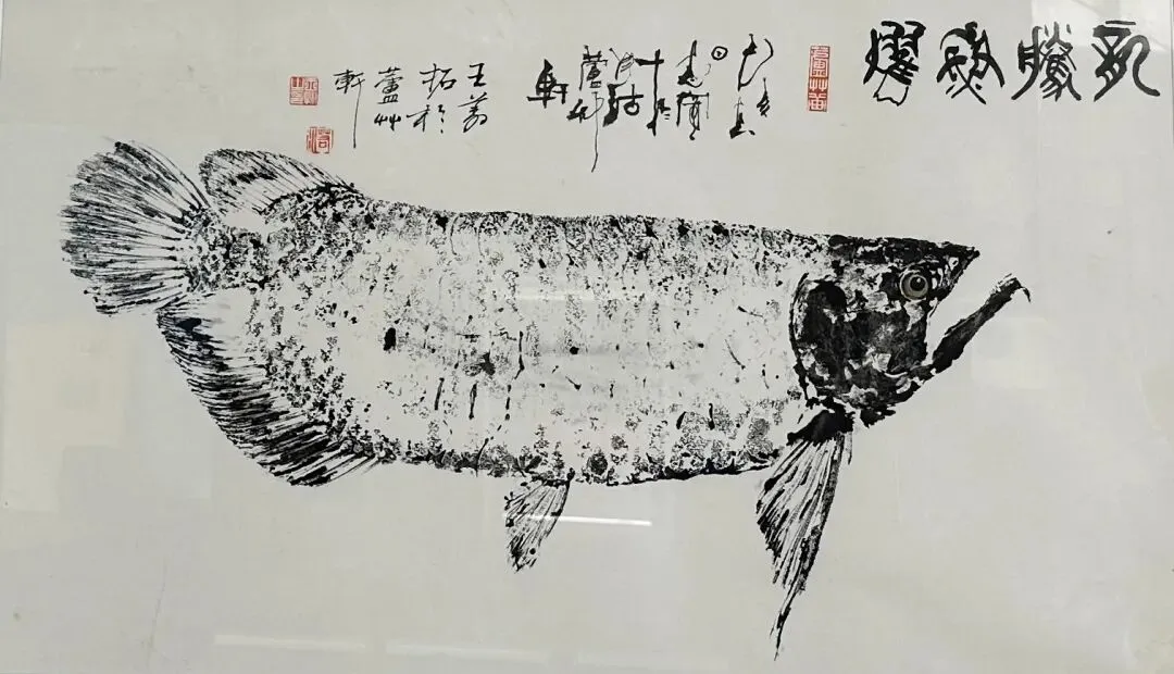 其中,水墨拓鱼作为核心展品,将古老的鱼拓技艺推向全新境界——它承袭中国传统鱼拓非遗技艺,以鱼为原型、水墨为彩料、拓印为技法,作者落笔沉稳、施拓精准,从鱼身轮廓到层层鳞片,从舒展的鱼鳍到飘逸的鱼尾,每一处细节都刻画得细腻逼真、纤毫毕现。同时,鱼拓暗含“年年有余、吉庆安康”的美好寓意,兼具艺术美感与吉祥意蕴。