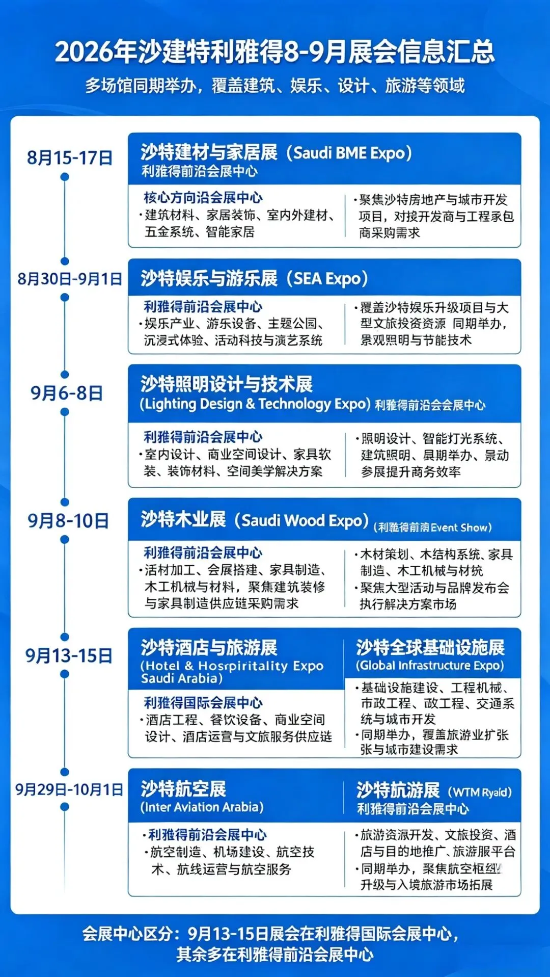2026年8-9月,利雅得将迎来全年最密集的专业展会档期,覆盖建筑建材、照明工程、室内设计、木业家居、活动会展、酒店文旅、基础设施、航空产业等核心赛道,是中国企业出海中东、对接当地政府、开发商、工程方、渠道商的黄金窗口期。