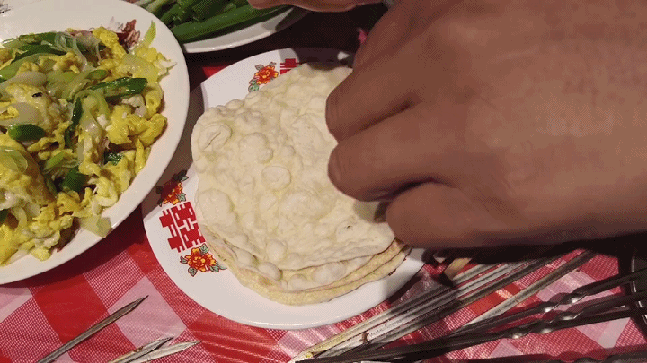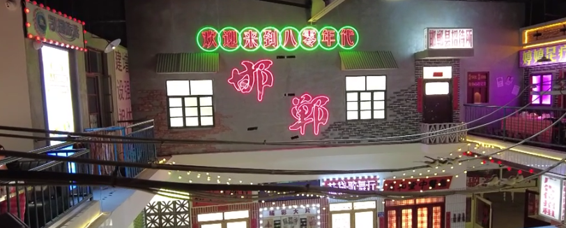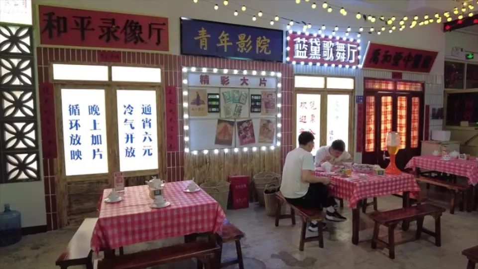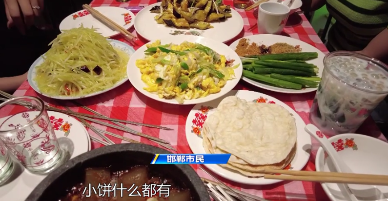 新世纪中心广场7楼,有一家非常有特色的烧烤饭店,80年代邯郸老城区的感觉,录像厅、缝纫机、电视墙,整体氛围非常复古,包括贴着瓷砖的墙都非常有年代感。卷饼小葱烤串,标准淄博吃法现在在邯郸烧烤店内也可以轻松品尝到了。