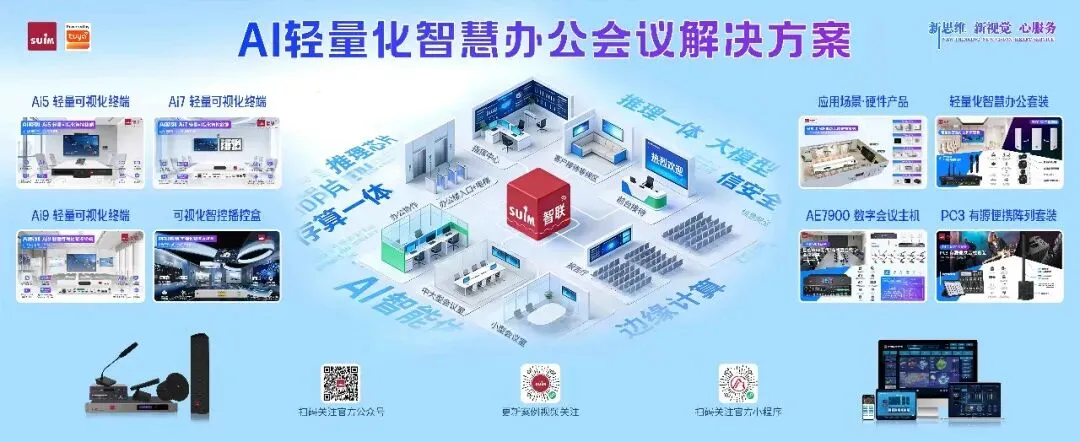 本次展会,SUIM携AI轻量可视化智控终端一站式智会办公会议解决方案、全场景IoT智联设备、一根网线全网络架构三大核心产品矩阵登场,精准覆盖政企办公、智能会议室、多功能展厅、智慧空间等多元场景。