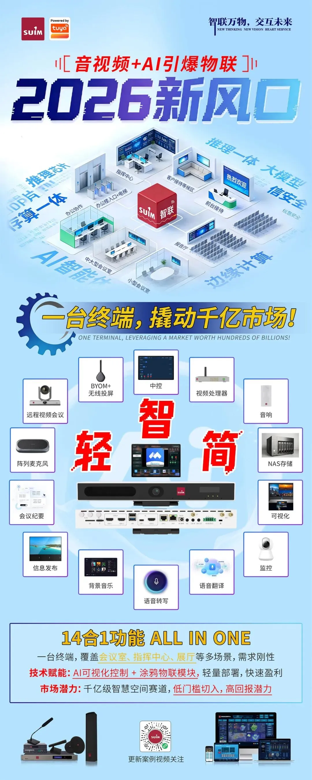 产品搭载新一代智能交互技术,实现极简部署、全设备无缝联动、AI语音一键智控,操作更便捷、运行更稳定、适配性更强,彻底解决传统办公场景布线复杂、操控繁琐、兼容性差等痛点,打造高效、智能、极简的现代化办公体验。无论是中小型会议室,还是大型展览展厅,都能快速落地适配,全方位满足不同客户的智能化升级需求。
