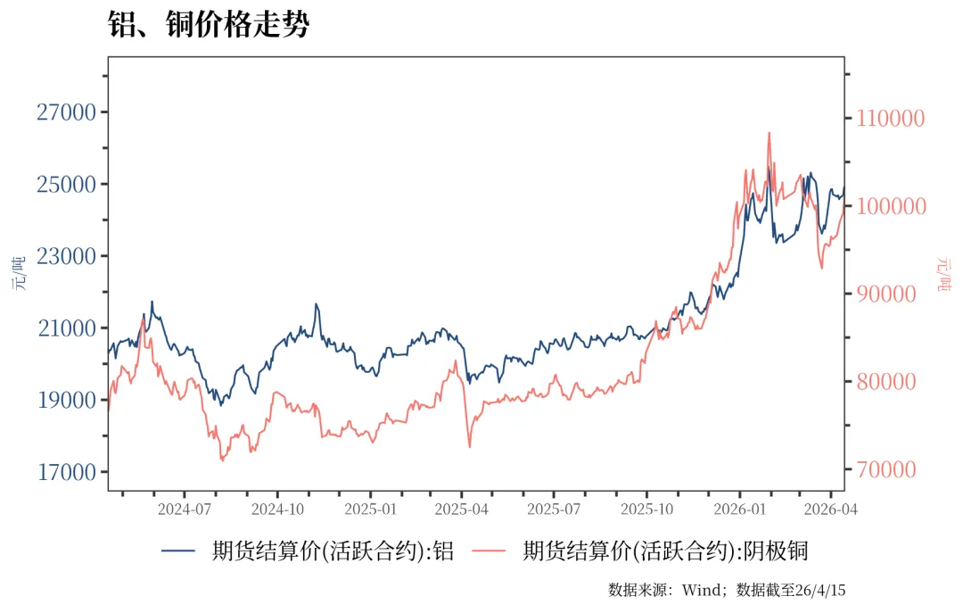 铝价方面,4月15日,铝期货主力合约24840元/吨,较上一交易日下跌0.30%。铜价方面,4月15日,阴极铜期货主力合约102280元/吨,较上一交易日上涨1.57%。