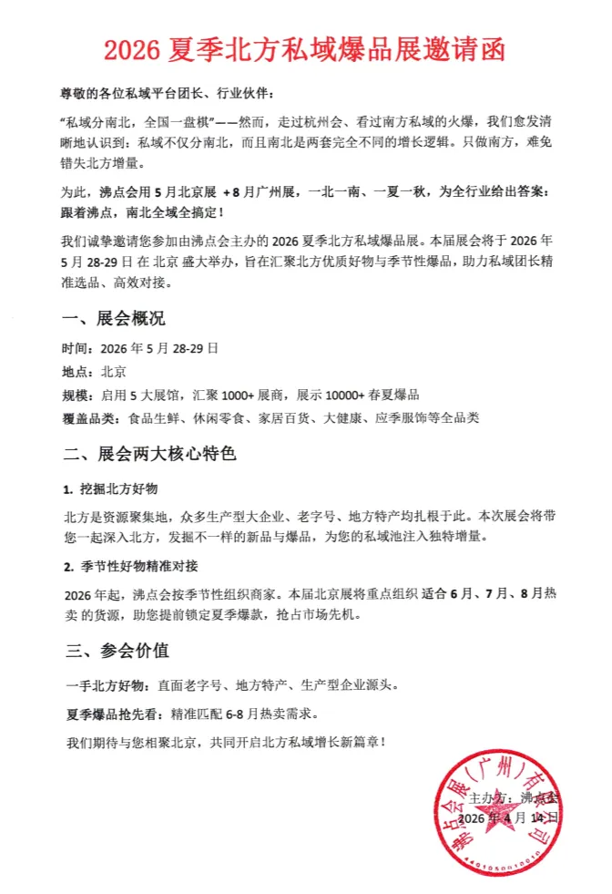 我们诚挚邀请您参加由沸点会主办的 2026夏季北方私域爆品展。本届展会将于 2026年5月28-29日 在 北京 盛大举办,旨在汇聚北方优质好物与季节性爆品,助力私域团长精准选品、高效对接。