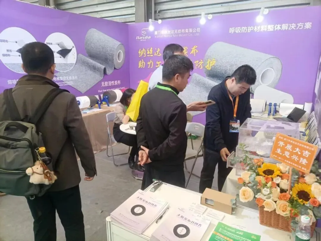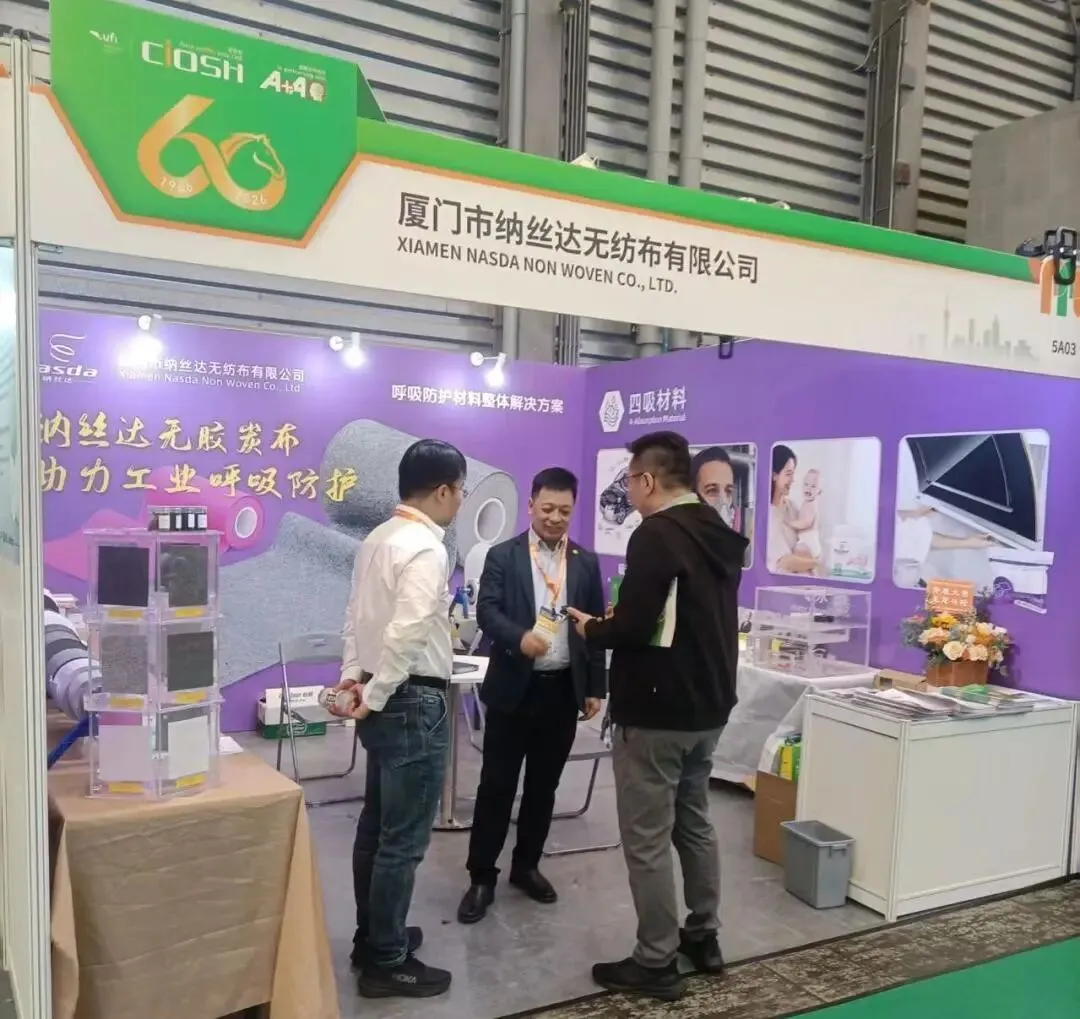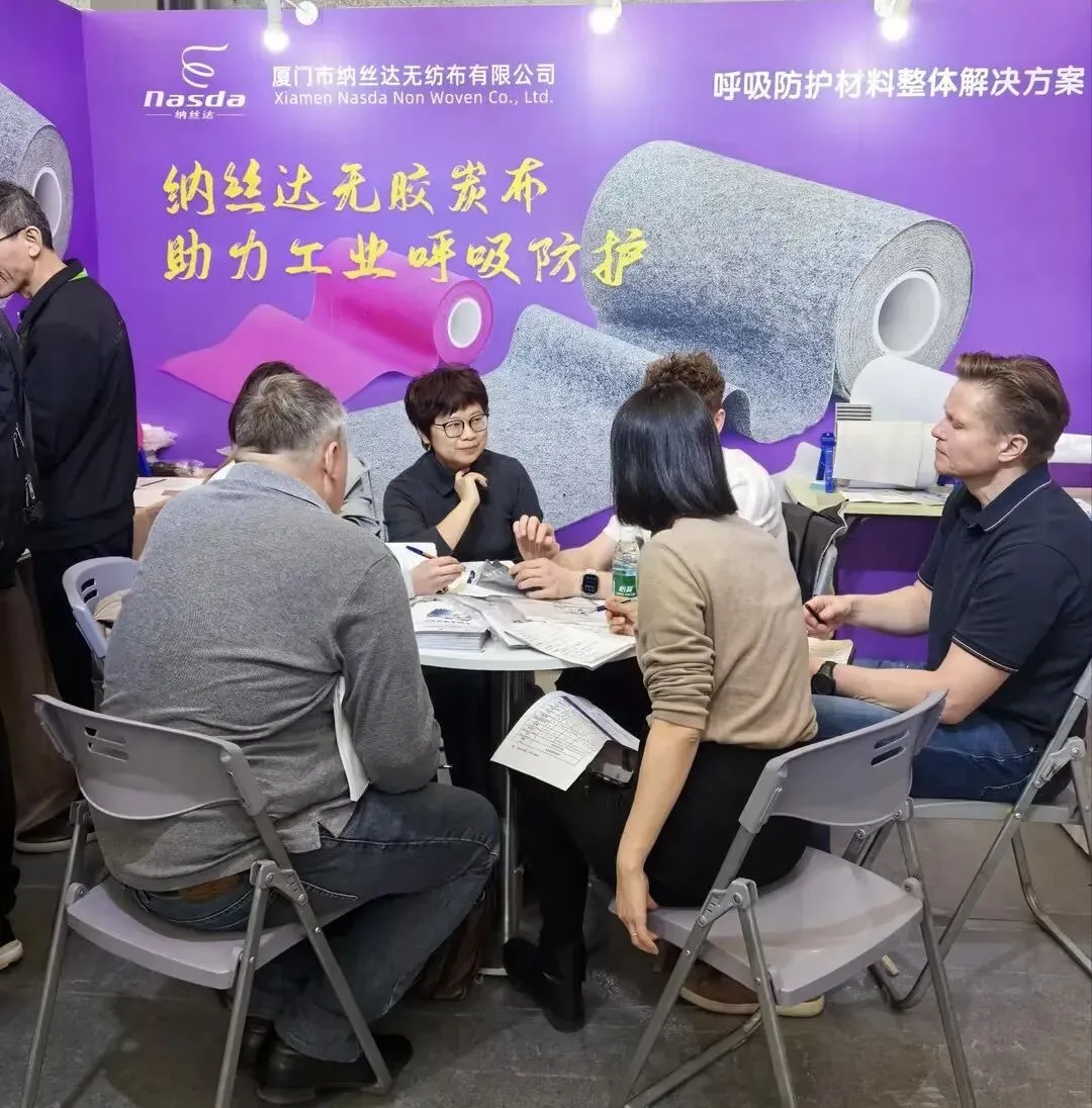 为期三天的行业盛会,纳丝达展位前人流不断。来自广东、浙江、辽宁、北京、河北、山东、山西、巴西、俄罗斯等国内外呼吸防护专业观众、企业安全管理者及合作伙伴纷纷驻足,围绕无胶炭布、四吸材料、高效低阻熔喷、纳米微孔膜等核心产品深度交流、现场体验、洽谈合作。