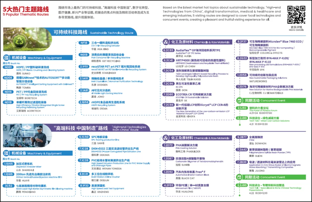 详细罗列了国际橡塑展9个机械专区、8个材料专区和8个国家/地区展团中的核心展品和具体方位。即使17大主题专区错落分布于16个展馆中,也能让您快速找到目标方向。