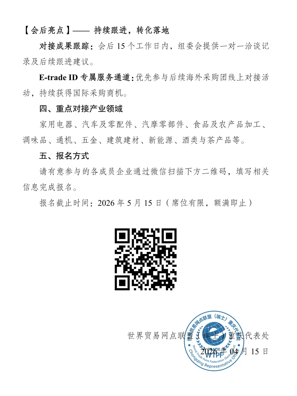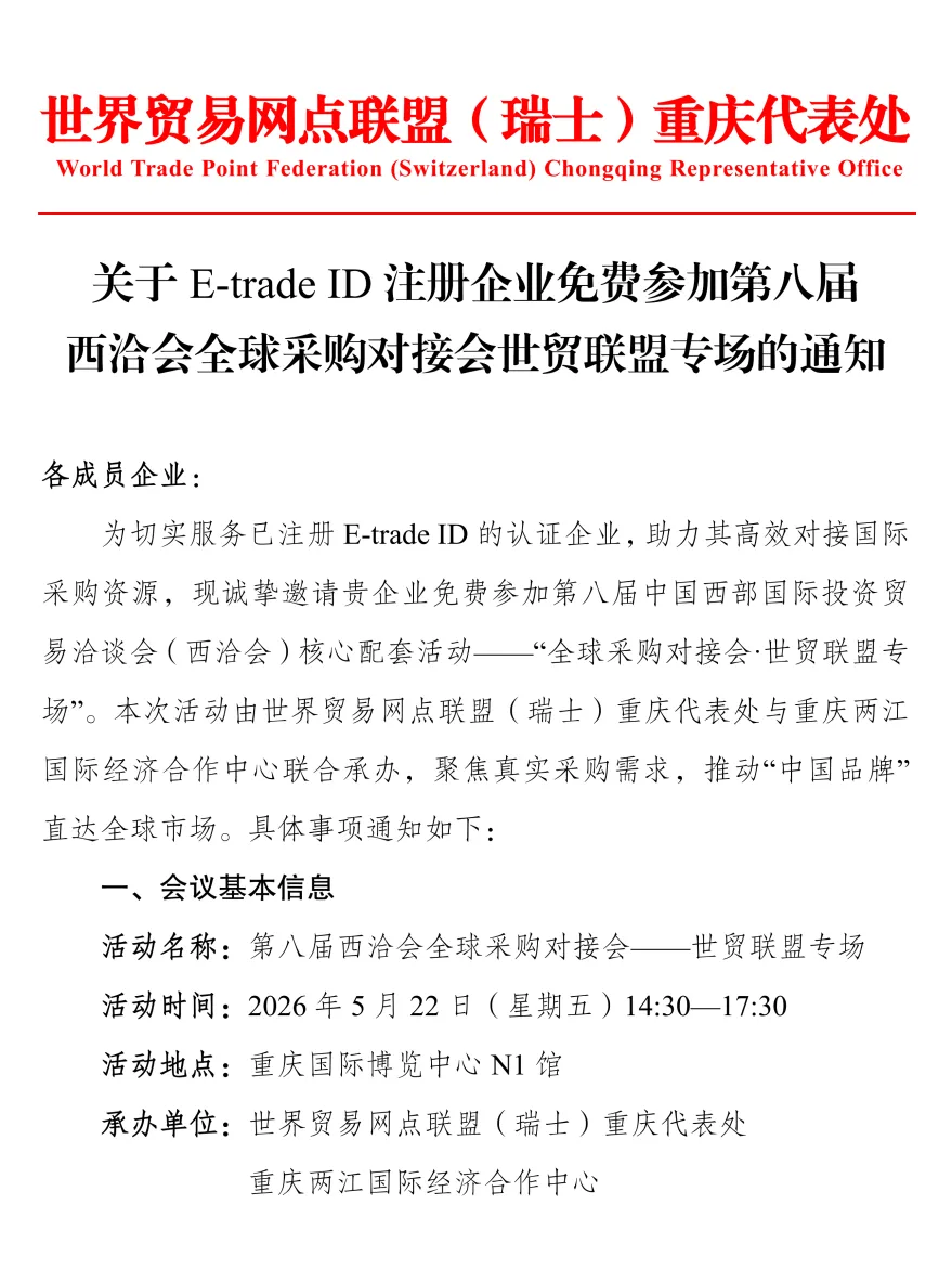 为切实服务已注册E-trade ID的认证企业,助力其高效对接国际采购资源,现诚挚邀请贵企业免费参加第八届中国西部国际投资贸易洽谈会(西洽会)核心配套活动——“全球采购对接会·世贸联盟专场”。本次活动由世界贸易网点联盟(瑞士)重庆代表处与重庆两江国际经济合作中心联合承办,聚焦真实采购需求,推动“中国品牌”直达全球市场。具体事项通知如下: