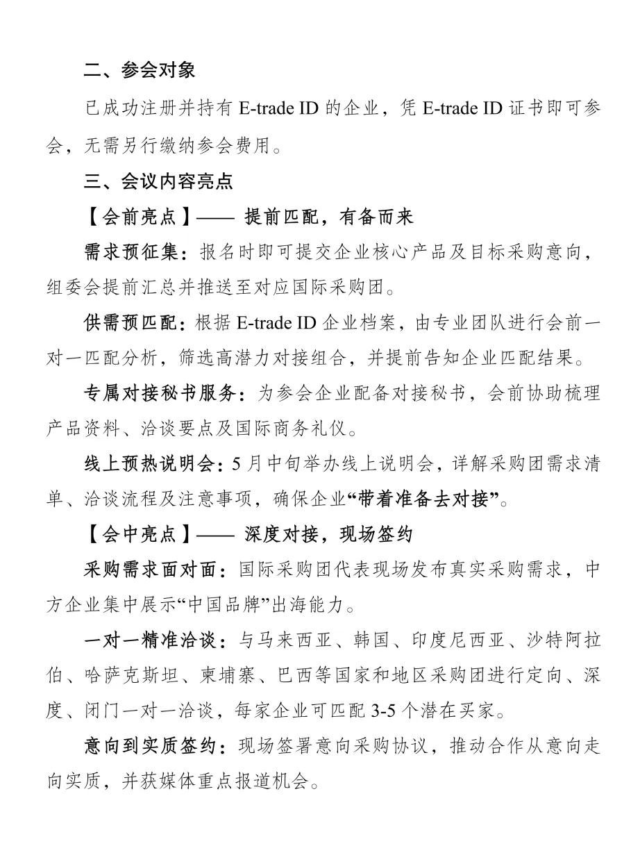需求预征集:报名时即可提交企业核心产品及目标采购意向,组委会提前汇总并推送至对应国际采购团。